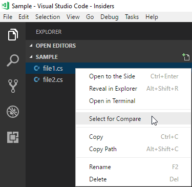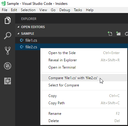 "%LOCALAPPDATA%\Programs\Microsoft VS Code Insiders\Code - Insiders.exe" --diff file1.cs file2.cs