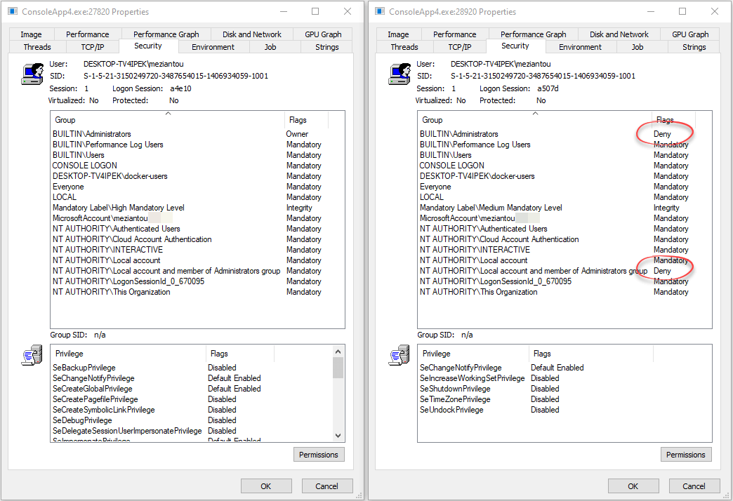 You can view the access token of a process using Process Explorer. In the following screenshot, the admin token is on the left, the filtered token is on the right. You can see the differences for the BUILTINS\Administrators group.