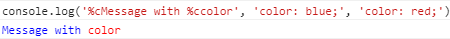 console.log('%cMessage with %ccolor', 'color: blue;', 'color: red;');