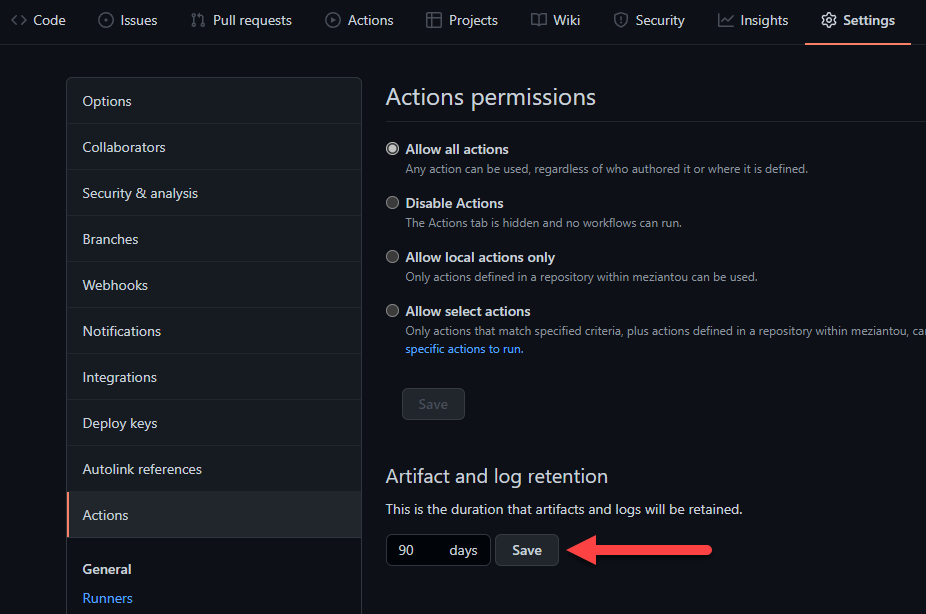 Once you have deleted the oldest artifacts, be sure to edit your workflow to automatically delete artifacts after several days by setting the retention-days property: