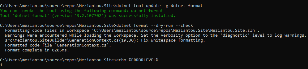 dotnet format returns a non-zero value when the code doesn't respect the coding style