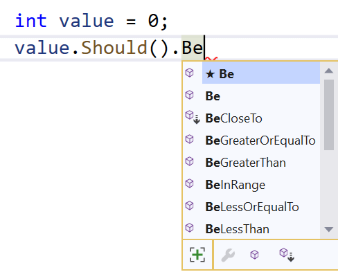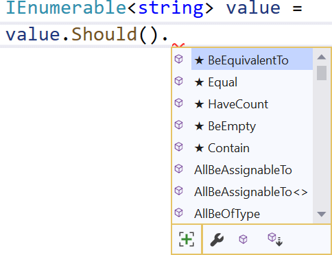 By making assertion discoverable, FluentAssertions helps you writing tests. Builtin assertions libraries often have all assert methods under the same static class. So, whatever the object you are asserting, all methods are available. FluentAssertions uses a specialized Should extension method to expose only the methods available for the type you are validating. This is very interesting to navigate across the numerous assertion methods.
