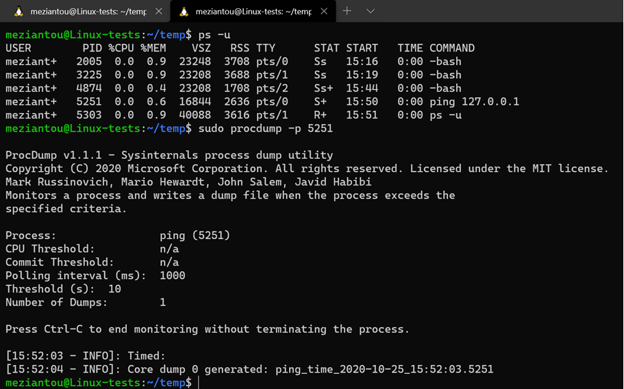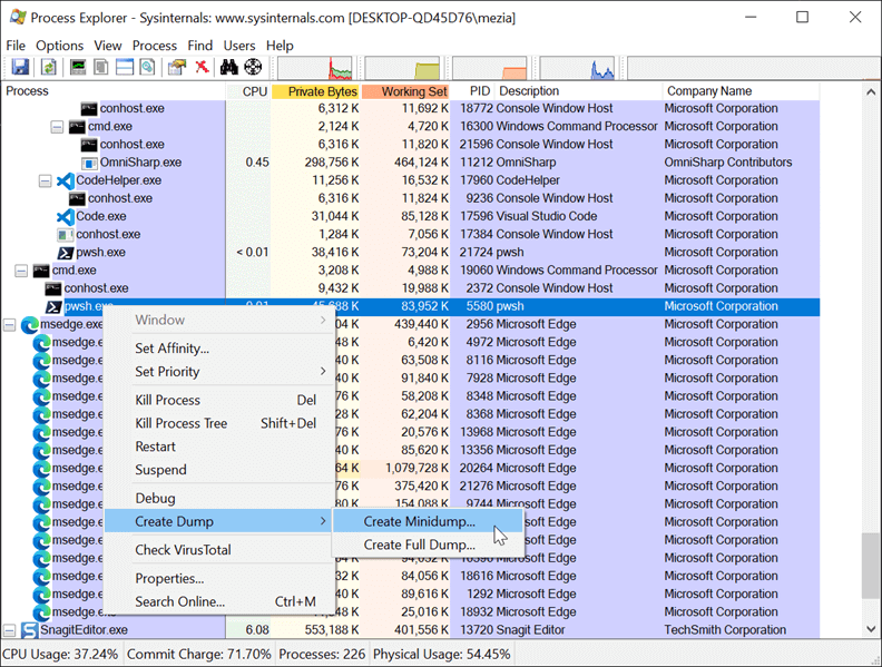 ProcDump is a command-line utility that allows generating a dump file when the application freezes or when the process uses too much CPU.