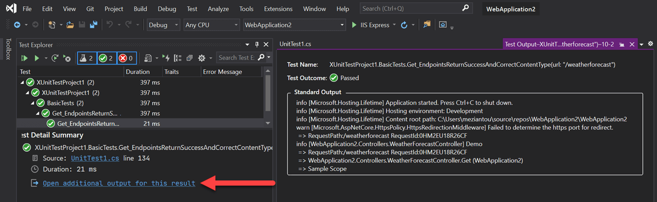 If you write integration tests, you should use WebApplicationFactory<T>. This type allows us to easily test an ASP.NET Core application using an in-memory test server. It is possible to integrate the XUnitLoggerProvider provider into the factory, so all loggers will output text to xUnit.