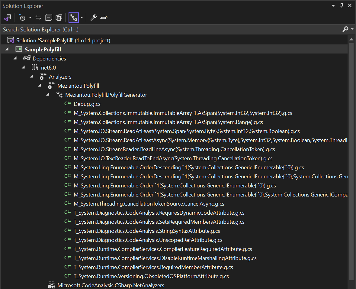 Meziantou.Polyfill is a source generator, so it can look at your code and add only what is needed. This means that each target may get different polyfills. For instance, if you target .NET 6, you may not need to polyfill the String.Contains(char) method. However, if you target .NET Standard 2.0, you may need to polyfill the String.Contains(char) method.