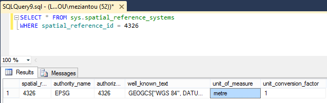 You can see that with the geography type the calculation of the distance is very simple: whatever the figure (Point, Line, Polygon) you can call the STDistance function. This function returns the distance in meters because we used the SRID 4326 (check the 3 INSERT above). You can also check this with the following query: