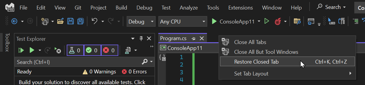 Visual Studio 2022 added a new feature to reopen the last closed tab: