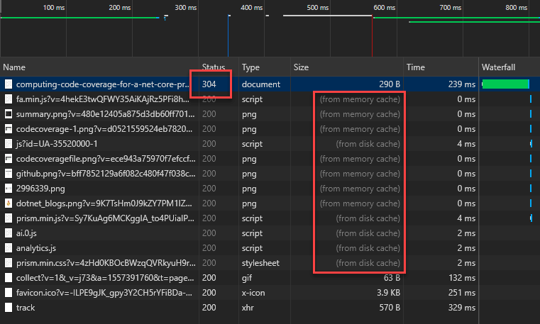 On this website, the second visit to a page is very fast because you only get a 304 (Not Modified) response from the server. So, the browser can use the cache to load the page: