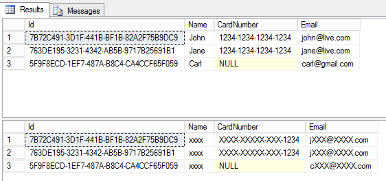 Dynamic Data Masking tries to answer this need by allowing to hide the contents of certain columns according to the rights of the connected user. Before seeing how this is parameterized, here is the result of the same query with 2 different users not having the same permissions: