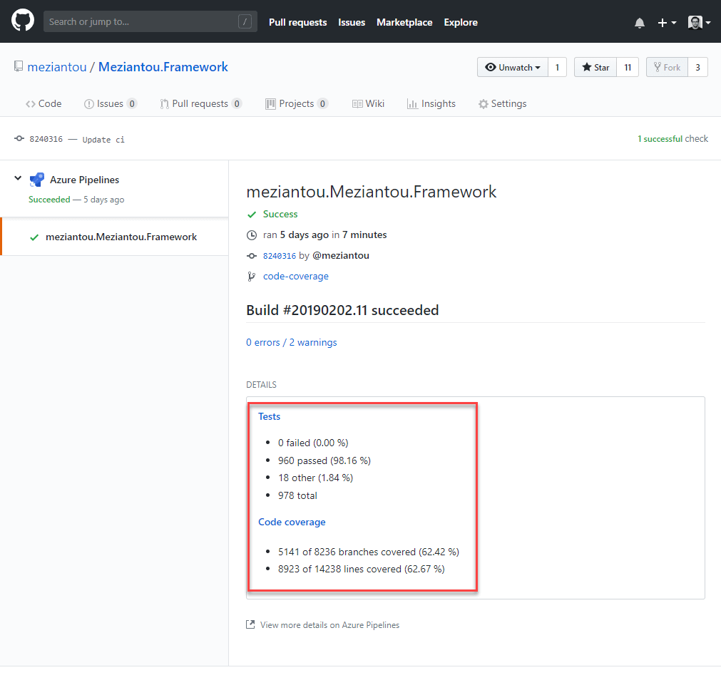 When you run a build, you now have the code coverage result in the Summary tab of the build: