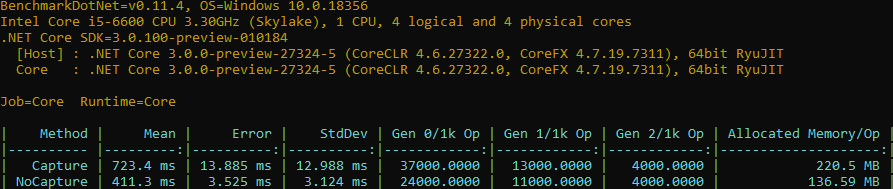 You can see that the version that captures the variable is about 77% slower and allocates 84% more! Allocations are very important because it means that the Garbage Collector may block your application later to free all the allocated objects.