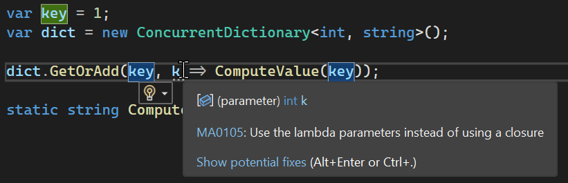 dictionary.GetOrAdd(key, _ => key.ToString()); // Don't use this code