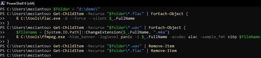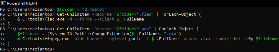 & C:\tools\ffmpeg.exe -hide_banner -loglevel panic -i $_.FullName -acodec alac -sample_fmt s16p $fileName