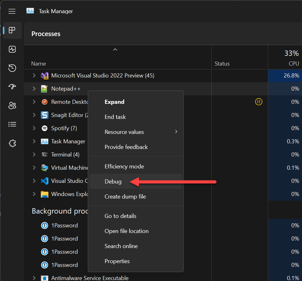 You can also use the Task Manager to start debugging a process: