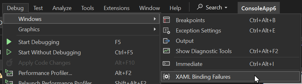 You can view XAML binding errors in Visual Studio. When running the application, all binding errors are shown in this window.
