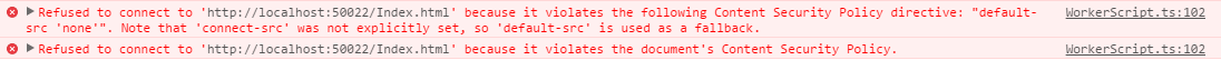 We currently have a great sandbox, but browsers provide another way to prevent the browser from doing unwanted actions. Content Security Policy (CSP) allows the web site owner to specify what the browser can do and can't do: expected urls, use the eval function, allow inline scripts, etc. CSP also works with web workers, so let's use it to provide more security (Defense in depth). When the web server serves the JS file to the client, it must also send an http header Content-Security-Policy containing a list of directive. For our worker we use the following directives: