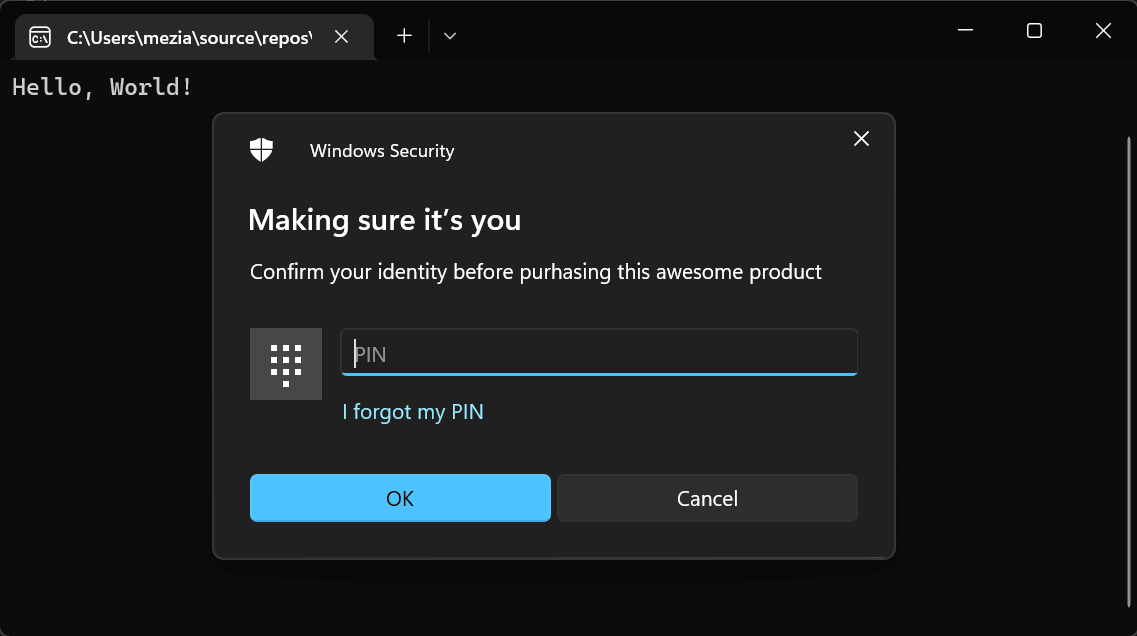 Before executing sensitive actions, such as purchasing something or showing sensitive data, you need both user consent and confirmation that the legitimate user is performing the action. Windows provides an API specifically designed for this.