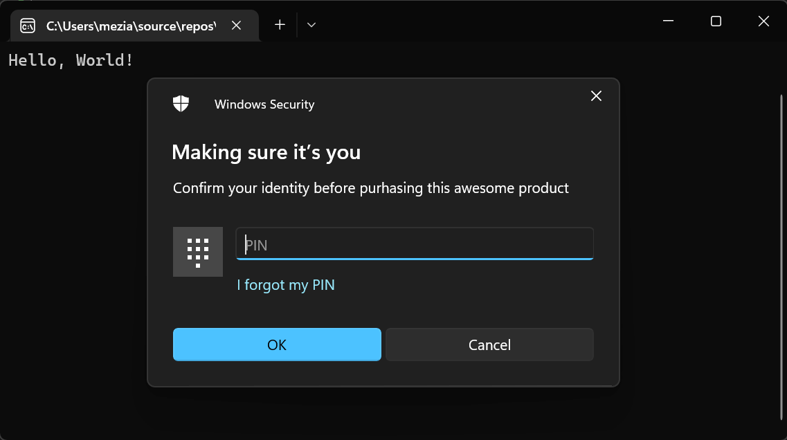Before executing sensitive actions, such as purchasing something or showing sensitive data, you need to get user consent. Also, you need to ensure the actual user is the one who is executing the action. Windows provides an API to get user consent before executing sensitive actions.
