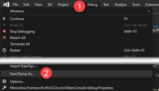 If you are debugging an application, you can save a dump file directly from Visual Studio. Open the "Debug" menu and click the "Save dump as…" menu item: