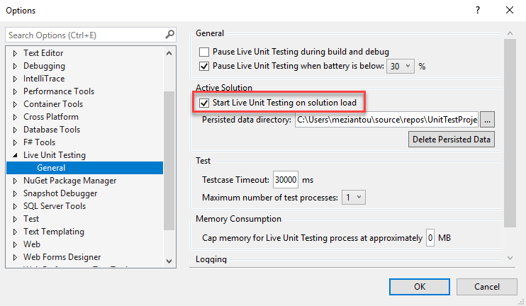 You can enable live unit testing automatically when you open the solution in the options window: