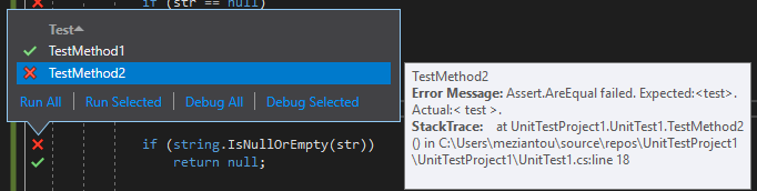 Now, let's add a test that fails. A red check is added in front of the lines of code. This indicator override other indicators. By clicking on a red cross, you can see the details of each test that covers the selected line.
