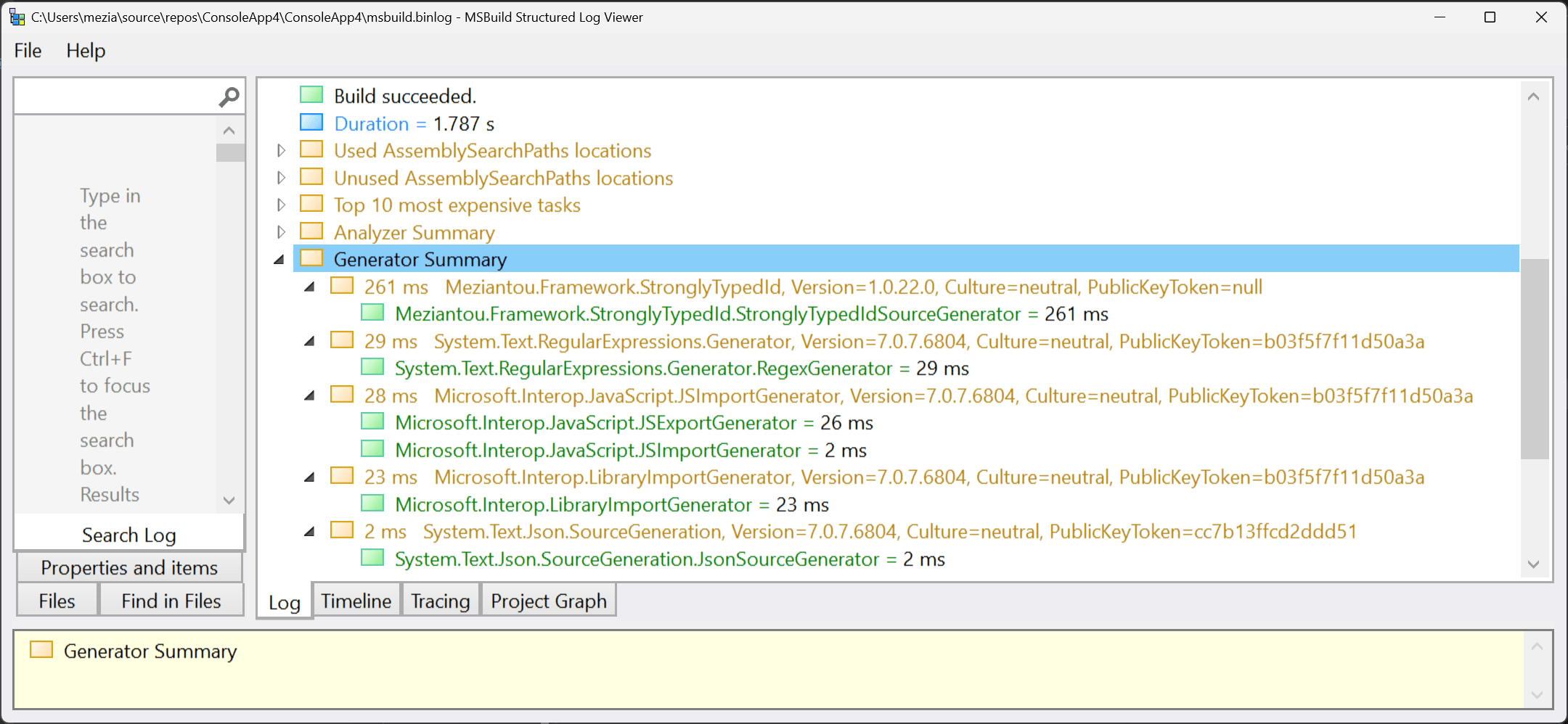 This creates an msbuild.binlog file containing the execution time of each source generator. Open it with the MSBuild Structured Log Viewer: