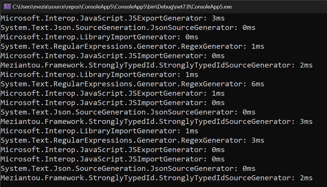 Console.WriteLine($"{generatorName}: {TimeSpan.FromTicks(ticks).TotalMilliseconds:N0}ms");