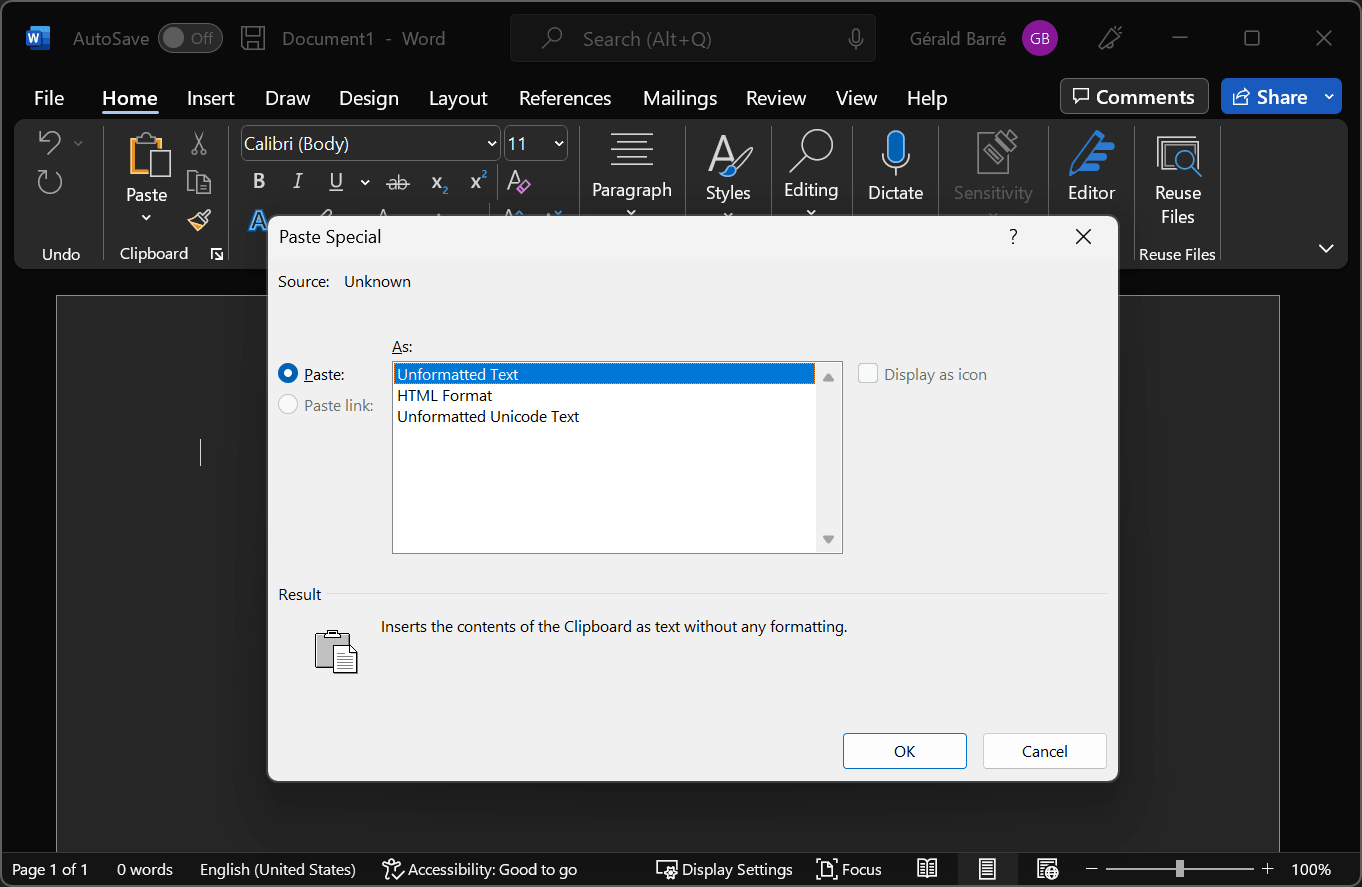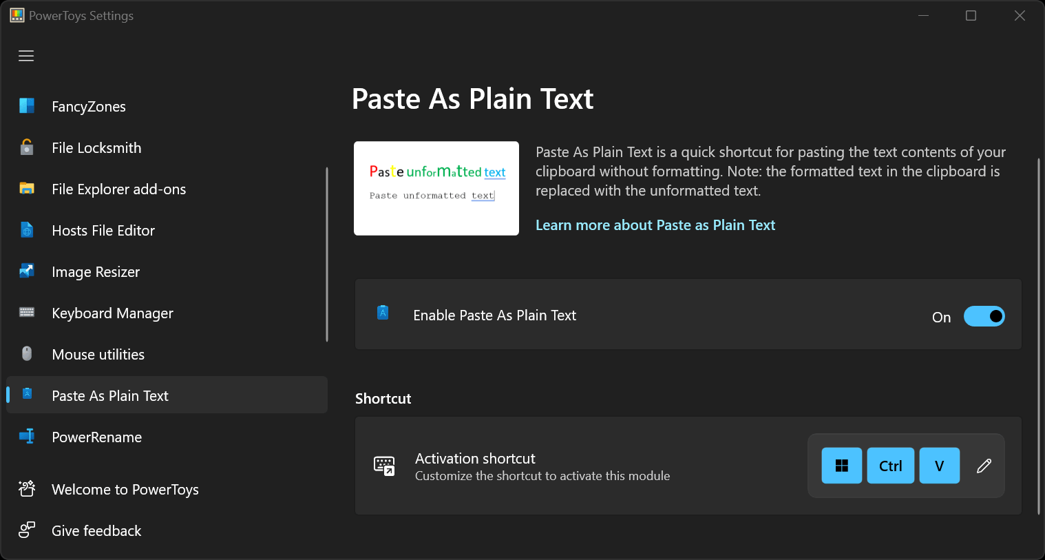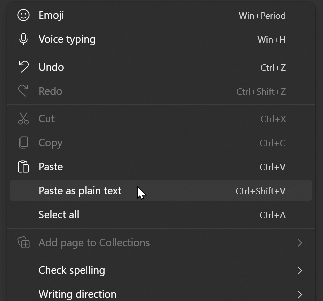 Using Windows PowerToys - Paste as Plain Text: Ctrl + Win + V