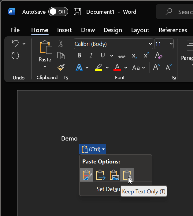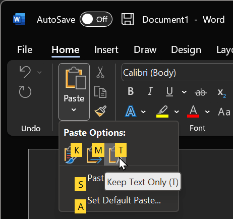 Microsoft Office (method 2): Ctrl + V, then Ctrl, then T