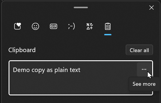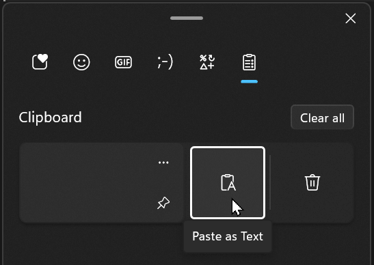 Windows: Win + V, then click "…" (see more), then "Paste as text". To navigate with the keyboard, press Tab then Enter to select the option: