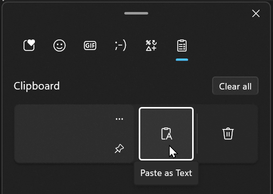 Windows: Win + V, Then click "…" (see more), Then "Paste as text". To use the keyboard, you can press Tab Enter to select the option: