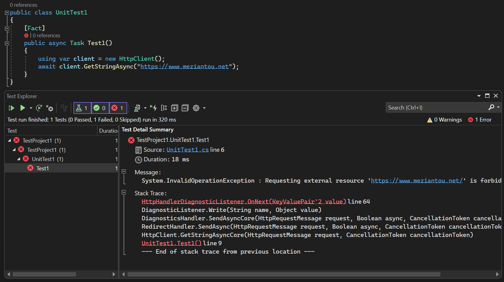 // When a request is sent to an external service, an exception is thrown and the test fails.