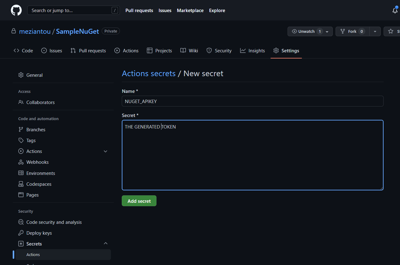 Then, create a secret named NUGET_APIKEY in the GitHub repository to store the API key. You can read more about it in the GitHub documentation.