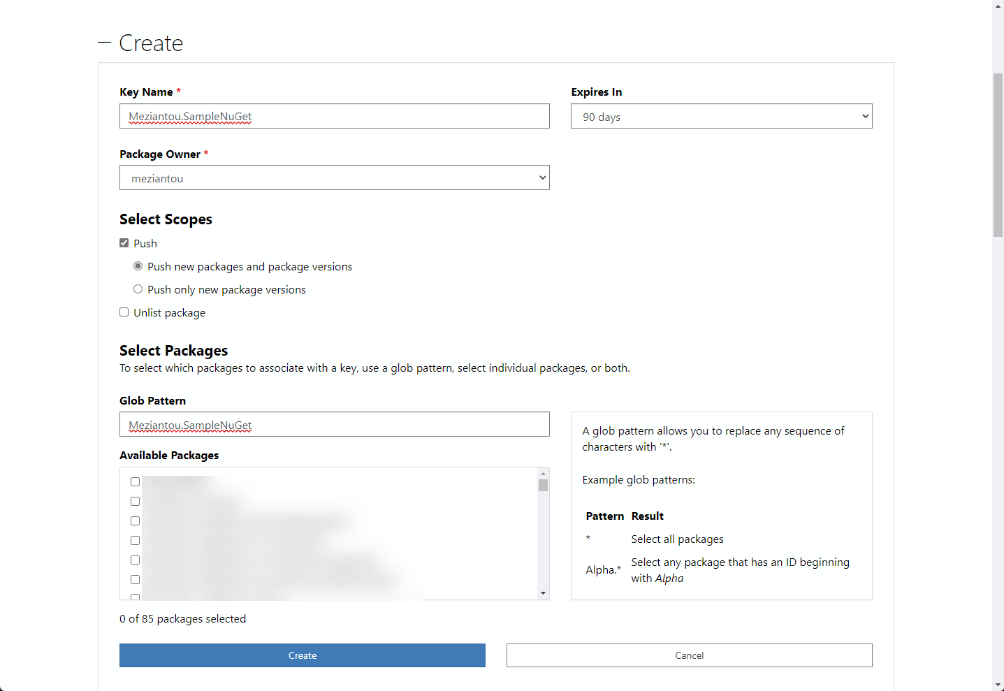 To publish the package to nuget.org, you need an API key. You can read more about it in the NuGet documentation. To create an API Key, open https://www.nuget.org/account/apikeys and expand the "Create" section. For security reasons, select the minimum required scopes and package glob to publish the package. Then, click on "Create" to generate the API key. Copy the API key and store it in a secure place.