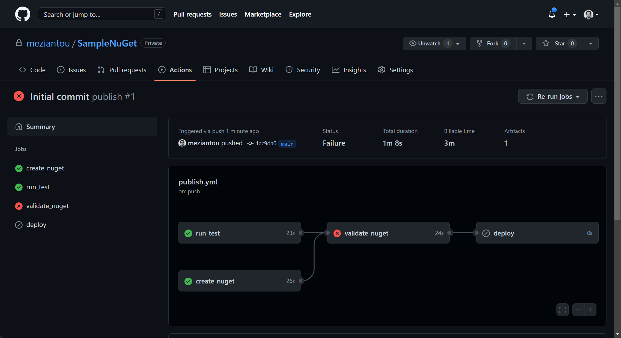 The GitHub Actions workflow should run immediately after pushing the commit. However, it will fail because the NuGet package validation fails. We will fix that next!