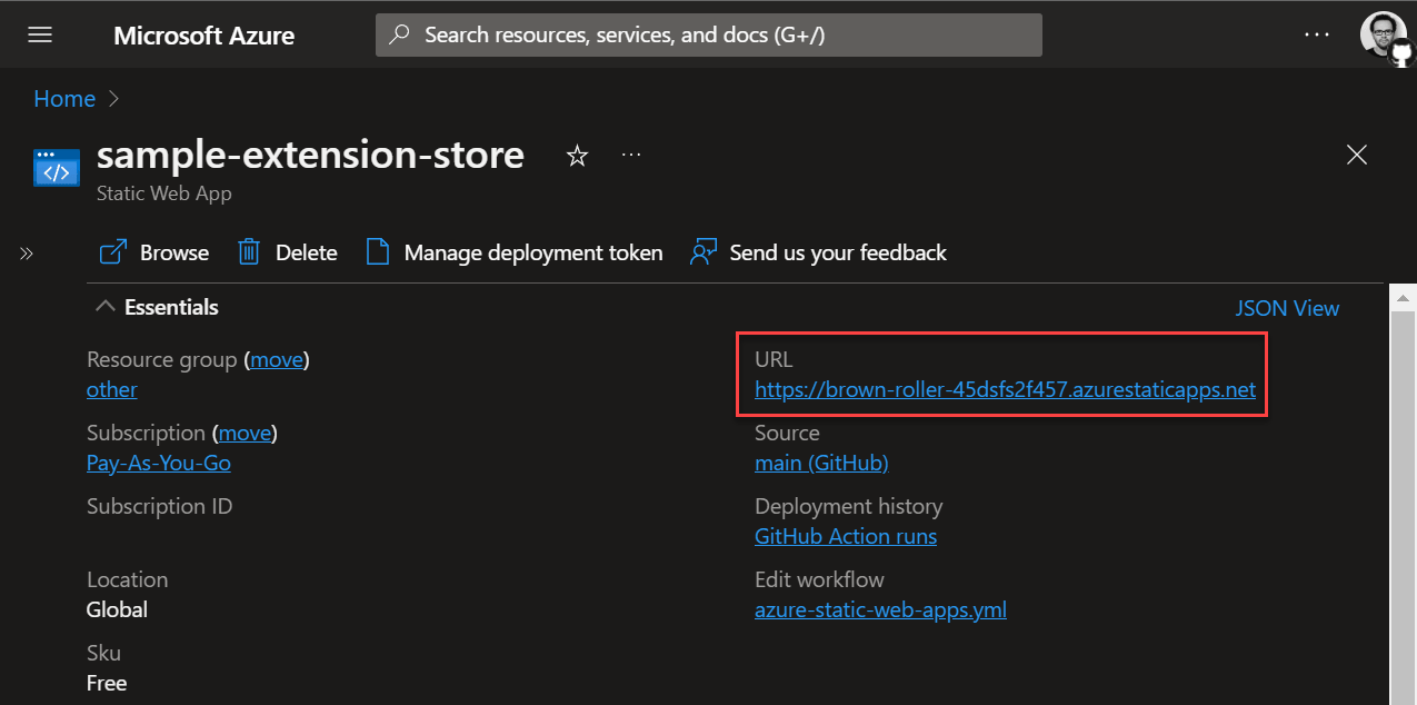 First, you need a domain name, either free or one you own. For this example, I'll use a free Azure Static Web App, which comes with a generated domain such as brown-roller-45dsfs2f457.azurestaticapps.net. It also provides static page hosting, which we'll use to serve the Chromium extension.