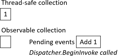 Add a second item to the collection ⇒ The first collection contains 2 items, the bindable collection is still empty has the dispatcher hasn't run the synchronization method