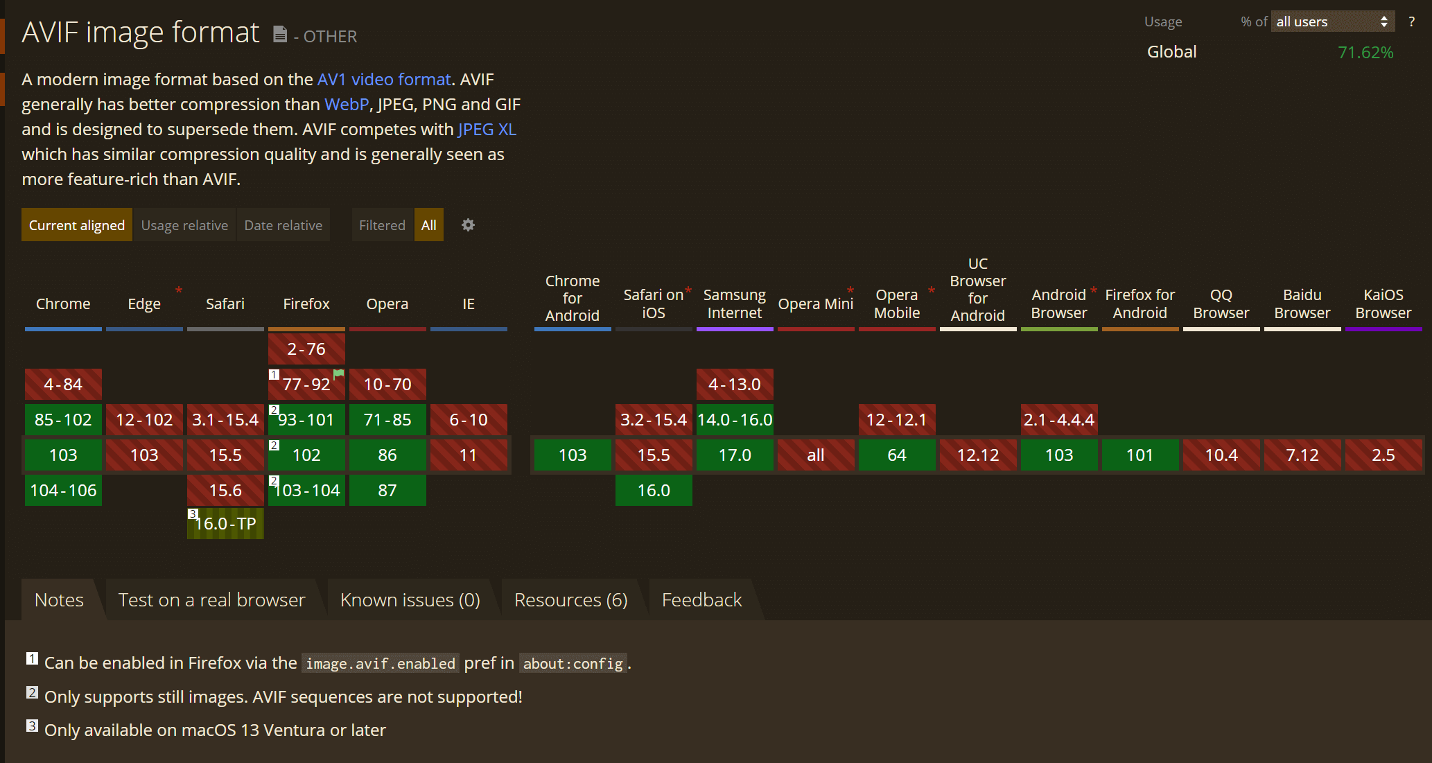 AV1 Image File Format (AVIF) is a new image format developed by the Alliance for Open Media (AOM). AV1 is currently supported by Chrome, Firefox, Opera, so about 70% of usages. Safari will support it starting with iOS 16 and macOS Ventura. Edge should support AVIF in the future.