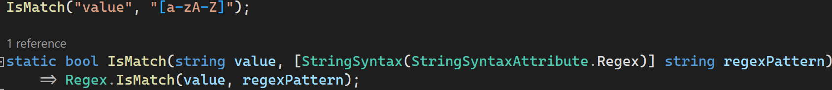 bool IsMatch(string value, [StringSyntax(StringSyntaxAttribute.Regex)] string regexPattern)